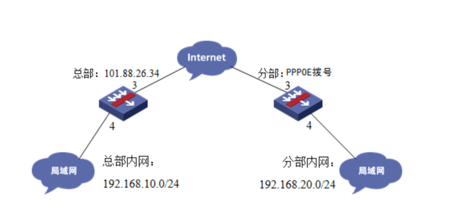 总部和分部各有一台防火墙部署在互联网出口,因业务需要两端内网需要通过VPN相互访问。IP地址及接口规划如下表所示:
