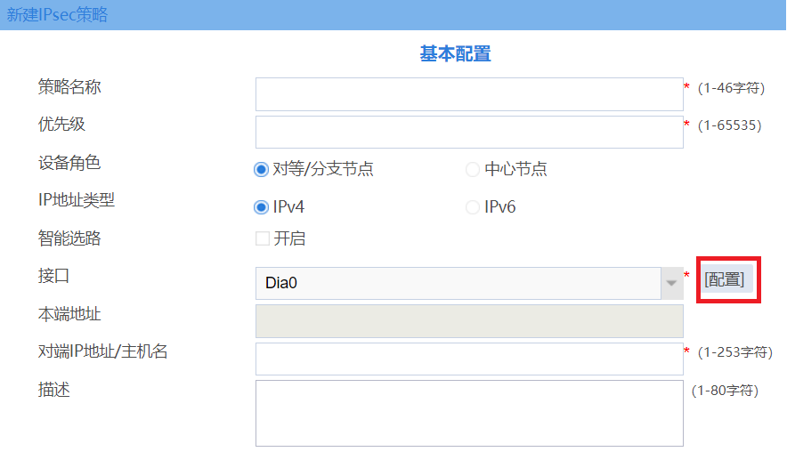 #创建IKE密钥,地址填写总部侧设备的公网IP,密码设置为123456。