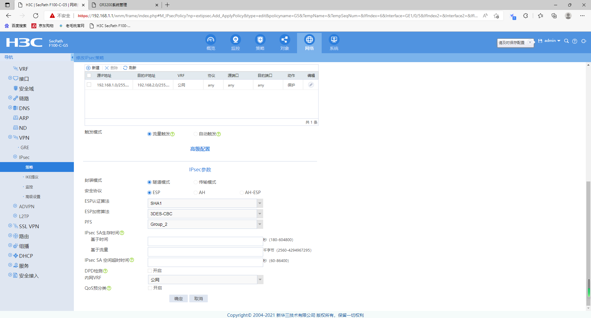 新厂有一台防火墙,老厂有一台GR3200路由器都部署在互联网出口,因业务需要两端内网需要通过VPN相互访问。