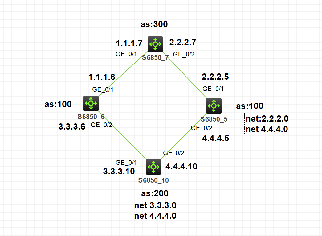 这个是大致组网,掩码都是24,为什么6设备可以ping通5设备,路由从as100出来不是不可以传递给as100吗,当6设备是as100不可以ping通2.2.2.7但是换一个as号就可以ping通,这个是为什么呢?求解