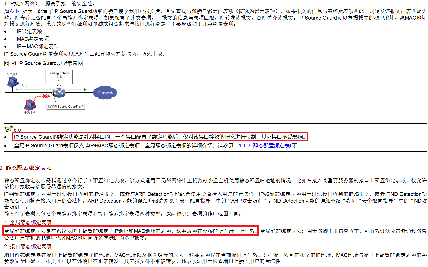 交换机设备上我在端口下做了ip与Mac绑定,那么此ip与Mac是在整个网络里面一一绑定呢还是仅在端口下面一一绑定。打个比方,端口1下面做了IP与Mac绑定,ip地址是10.1.1.2。那么这个ip如果在其它端口(或者其它连接的交换机端口)出现,会不会造成IP地址冲突问题,影响到端口1的业务呢?