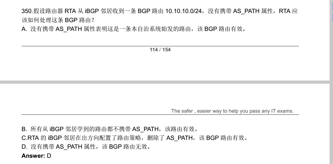 我认为本地始发的BGP路由不携带AS_PATH信息啊,我做了实验,其中AS_PATH貌似就是没有啊,那题目咋么说不携带AS_PATH会无效呢?