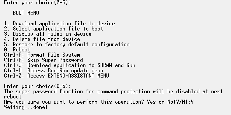 The super password function for command protection will be disabled at next reboot. Are you sure you want to perform this operation? Yes or No(Y/N):Y Setting...done!