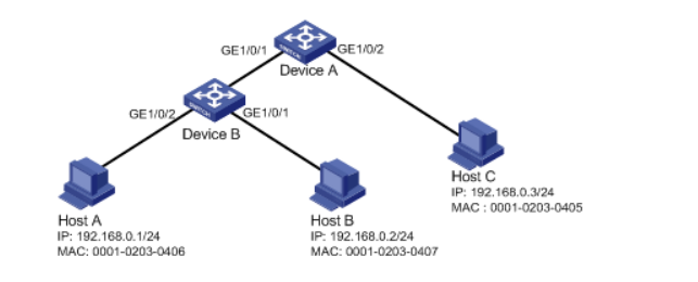 # 配置IPv4静态绑定表项,只允许MAC地址为0001-0203-0405、IP地址为192.168.0.3的Host C发送的IP报文通过端口GigabitEthernet1/0/2。