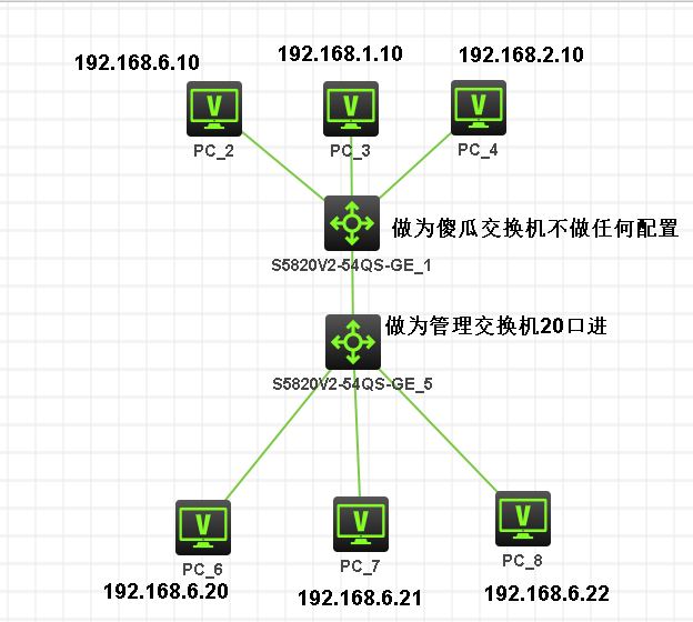 在这个结构 中,1与2段的也能通过管理交换机的 20口,怎么样配置能过滤掉这二个段,只允行6段的通过。求指点,麻烦帮给个命令多谢。