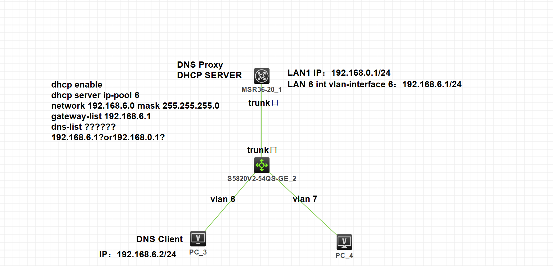 拓扑如下图,其中路由器为DNS Proxy设备,DHCP SERVER也部署在路由器上。