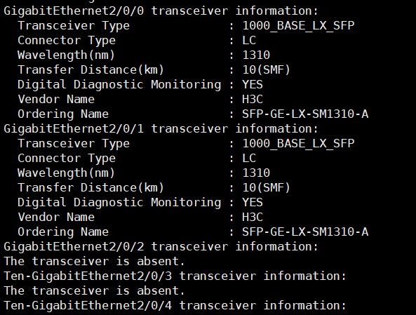 dis transceiver interface查看,插模块的能看到 没插模块的光口就是The transceiver is absent