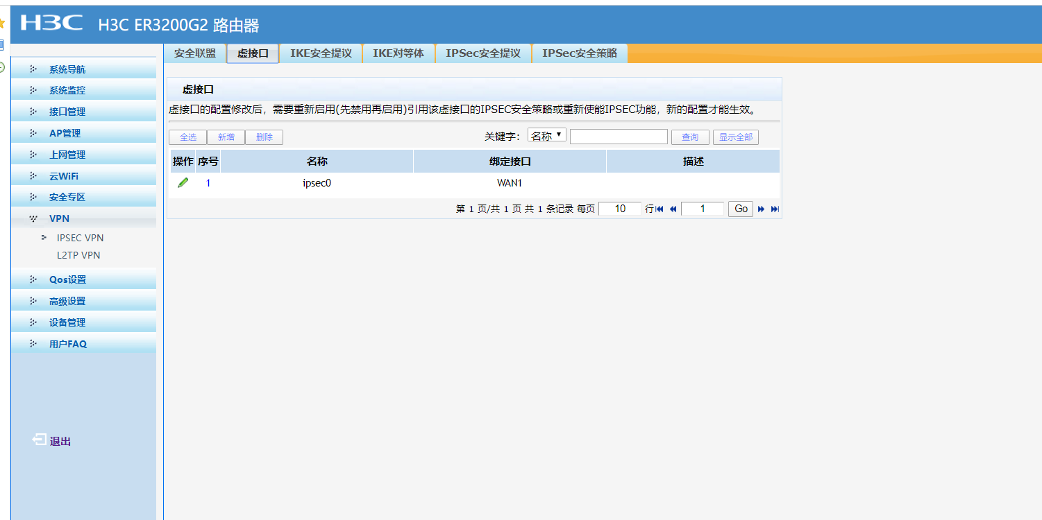 1. 选择“VPN→IPSEC VPN→虚接口”。单击<新增>按钮,在弹出的对话框中选择一个虚接口通道,并将其与对应的出接口进行绑定(此处假设为WAN1),单击<增加>按钮完成操作 | |