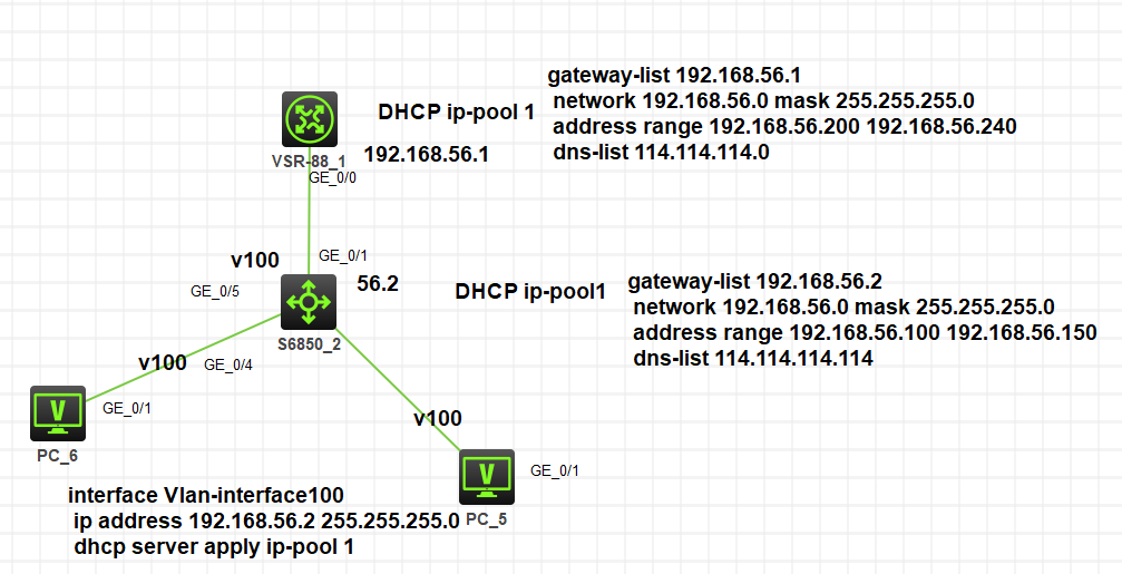 如图 网络中有两个DHCP服务器,配置完成后,pc得到的是192.168.56.200的地址,也就是路由器分配的,试了好几回都是这样,如果把路由器的0/0口断开,那么PC得到的是192.168.56.100 ,但我在真机上同样配的,为什么PC得到的地址可以是由交换机分配的