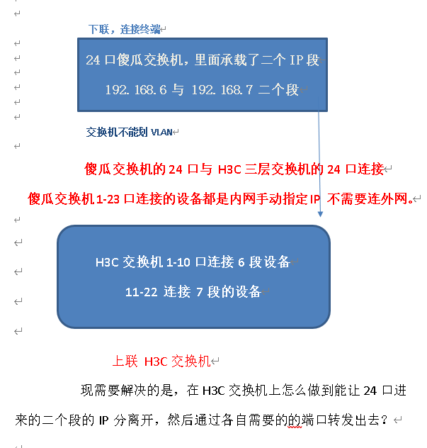 下联傻瓜交换机带了二个IP段,192.168.6 与 192.168.7 段,都属于内网不能访问外网。交换机的24口接在了 上联 H3C 5560 交换机24口。现想实现,从24口进来的二个IP段后,分别转发到对应的端口给服务器。具体如何实现。