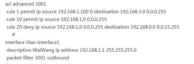 这一段的意思是,允许192.168.1.100 主机 访问目的 192.168.3.0 0.0.0.255网段;允许 192.168.1. 0 网段 访问任意目的地址;禁止 source 192.168.1.0 0.0.0.255 访问目的 192.168.0.0 0.0.15.255网段,综合来看,192.168.1.0网段中,1.100只能访问3.0网段、且1.0网段禁止访问192.168.0.0 0.0.15.255网段,1.0王网段的其他访问访问不受限制,
