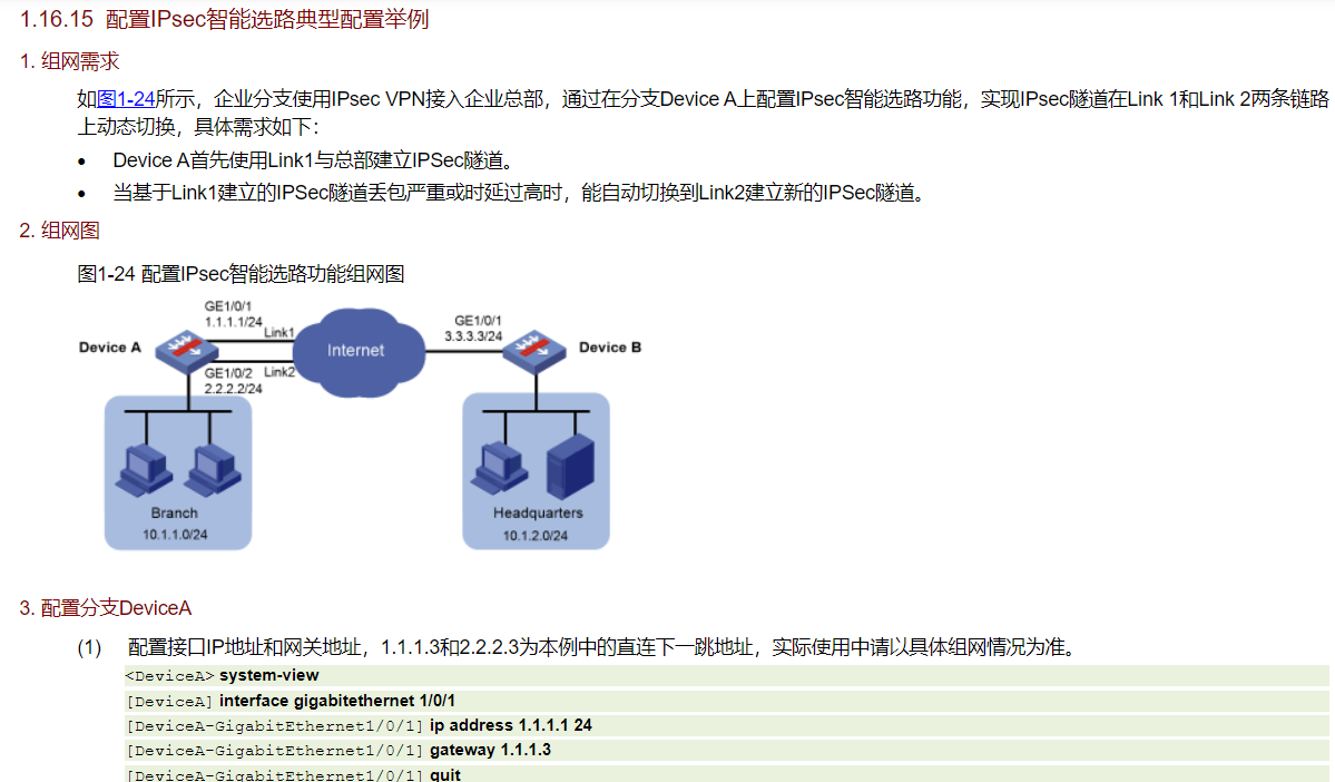 请问下防火墙两条外网配置IPSEC VPN,配置智能选路或者一条为备份的配置文档感谢