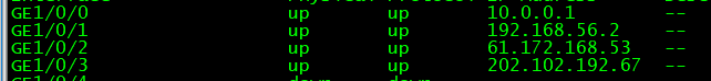 Destination/Mask Proto Pre Cost NextHop Interface 0.0.0.0/0 Static 60 0 61.172.168.54 GE1/0/2 172.16.0.0/16 Static 60 0 10.0.0.2 GE1/0/0