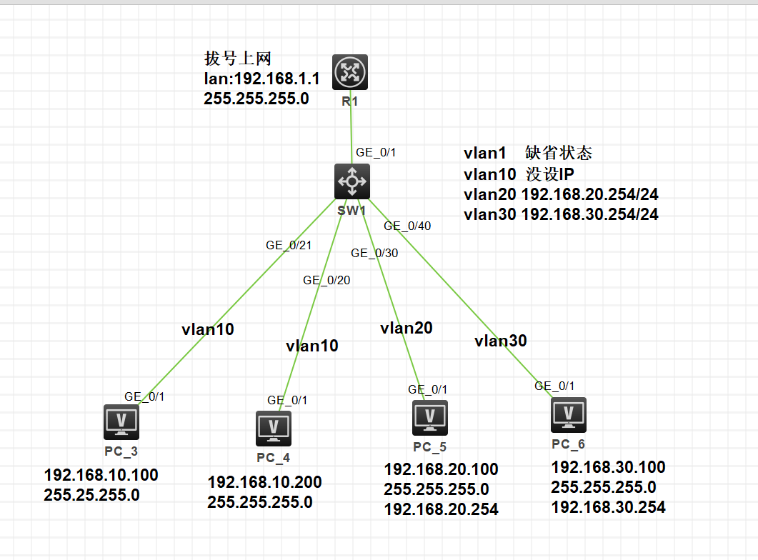 2、连接上R1后,需要下面的所有PC都能上网(且VLAN10不与其他VLAN进行通信),分别要做哪些配置与设置?