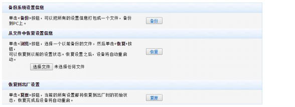 注意:恢复将清空全部配置,设备所有配置将恢复到出厂配置,请谨慎操作。