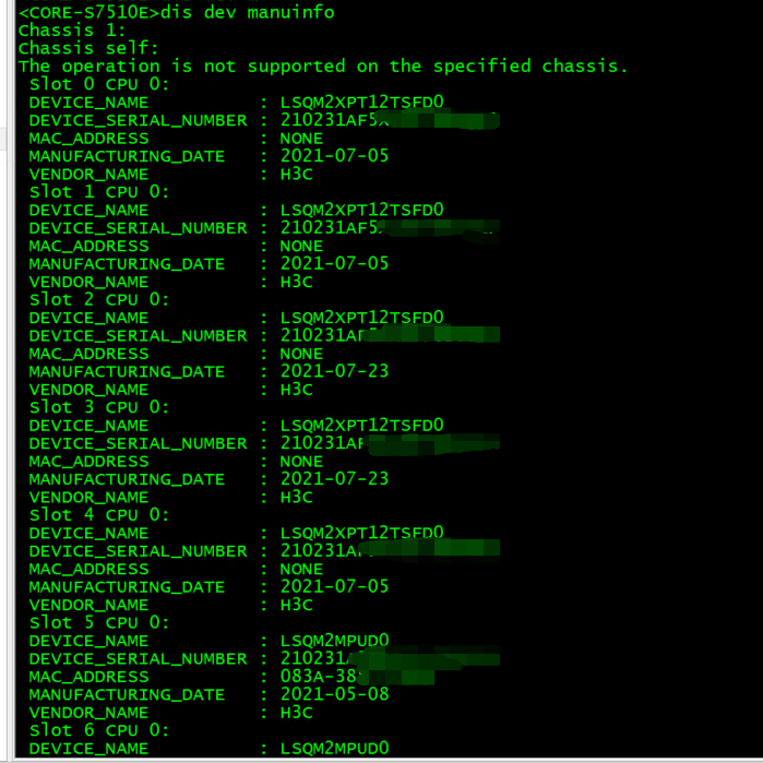 如何通过命令行查看7510E机框序列号,通过dis dev ma只显示了主控板和业务板等相关序列号,机框本身序列号没显示