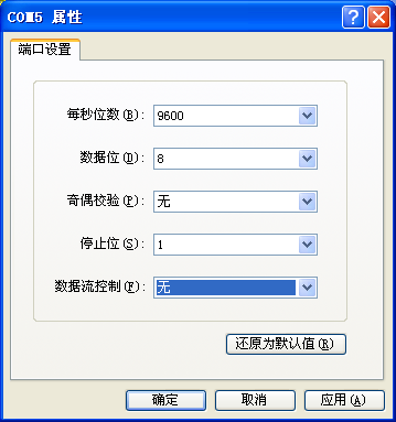 3、配置com口的属性,必须要和图中的一致,可以点击还原默认值。