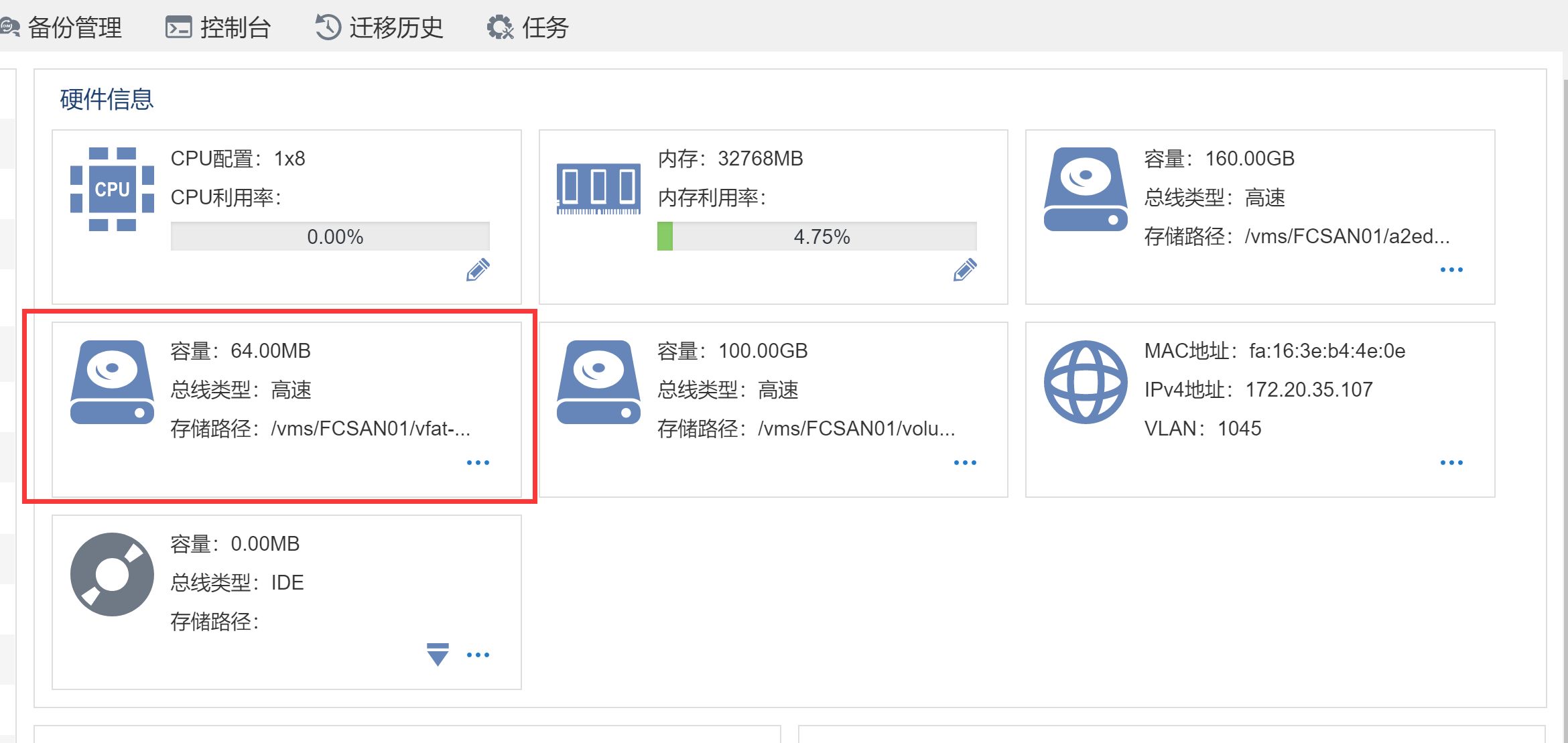 发虚拟机的时候选择计算节点专业初始化,虚拟机会多一块vfat驱动盘(64M大小)。这块盘是存储cloudinit-init 初始化数据(如ip、主机名、网卡信息等)的盘,不支持修改和删除。这个是openstack机制,相当于是封闭的模板,cloudinit-init往模板内注入信息。对虚机的运行不影响