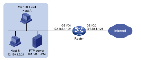 [Router-GigabitEthernet1/0/2] nat server protocol tcp global 202.38.1.2 inside 192.168.1.4 ftp