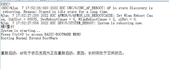 H3C> <H3C>%Jun 7 17:52:26:920 2022 H3C CWC/6/CWC_AP_REBOOT: AP in state Discovery is rebooting. Reason: Stayed in idle state for a long time. %Jun 7 17:52:27:200 2022 H3C APMGR/6/APMGR_LOG_REBOOTCAUSE: Set Wlan Reboot Cau se, SubSlot = 65535, DevRebootCause = 0, WlanRebootCause = 2, ulRet = 0. %Jun 7 17:52:27:556 2022 H3C DEV/5/SYSTEM_REBOOT: System is rebooting now. 槓?鞌? System is starting... Press Ctrl+D to access BASIC-BOOTWARE MENU Booting Normal Extend BootWare