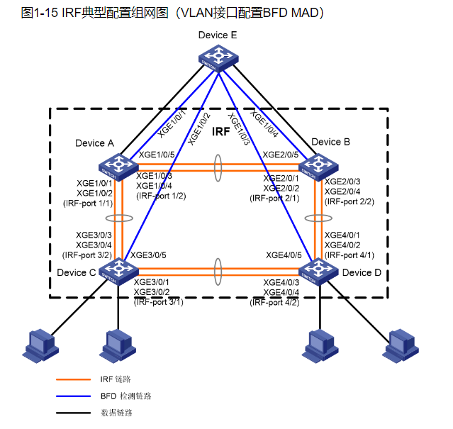常规多台交换机堆叠组网方式,irf 链路依次相连就行。堆叠分裂检测看你使用那种方式做。