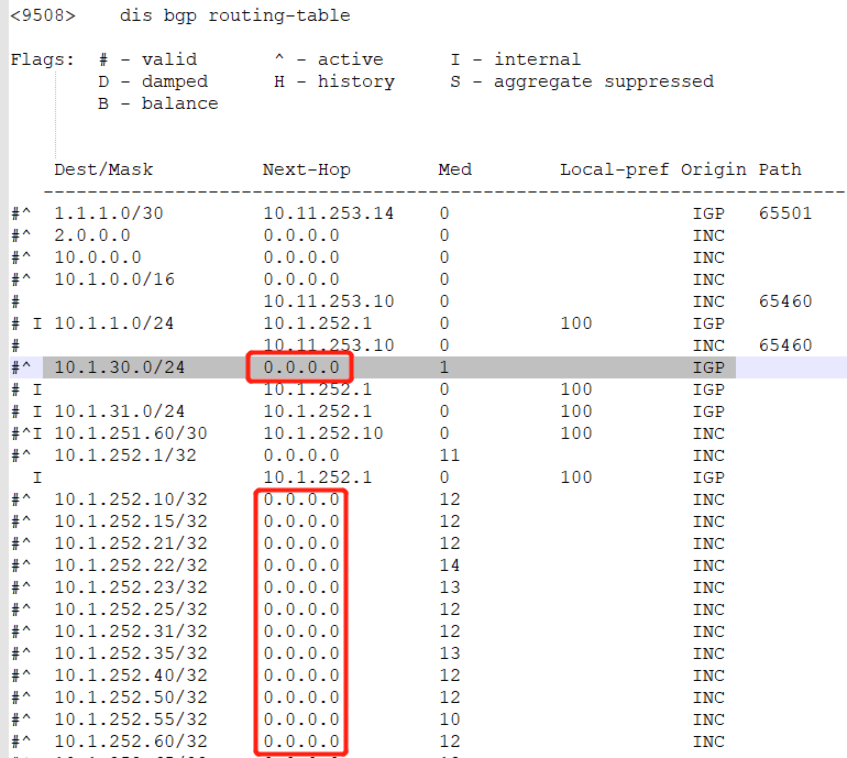 2、一般情况下,在本路由器上将直连的网络引入BGP,下一跳为0.0.0.0,本路由器聚合的路由的下一跳也为0.0.0.0。
