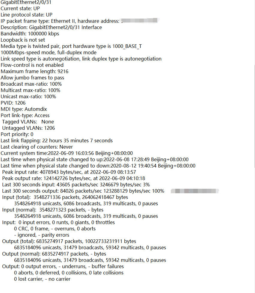 我在交换机上查看到接口Ge2/0/31的利用速率为100%,请问这种状态会导致丢包吗?如果会导致丢包,我该如何查看丢包信息呢?