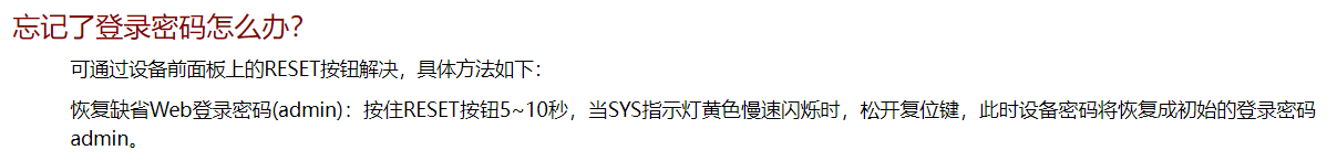 恢复缺省Web登录密码(admin):按住RESET按钮5~10秒,当SYS指示灯黄色慢速闪烁时,松开复位键,此时设备密码将恢复成初始的登录密码admin。