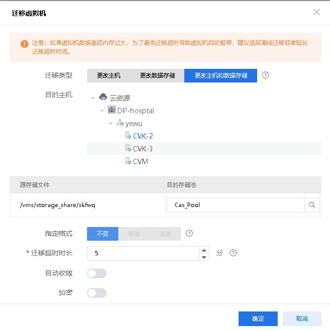 CVK上有两个临时硬盘,现在上了存储,准备将本地的两个磁盘上的内容迁移至存储上,现在报错是什么原因导致的。迁移步骤如上图