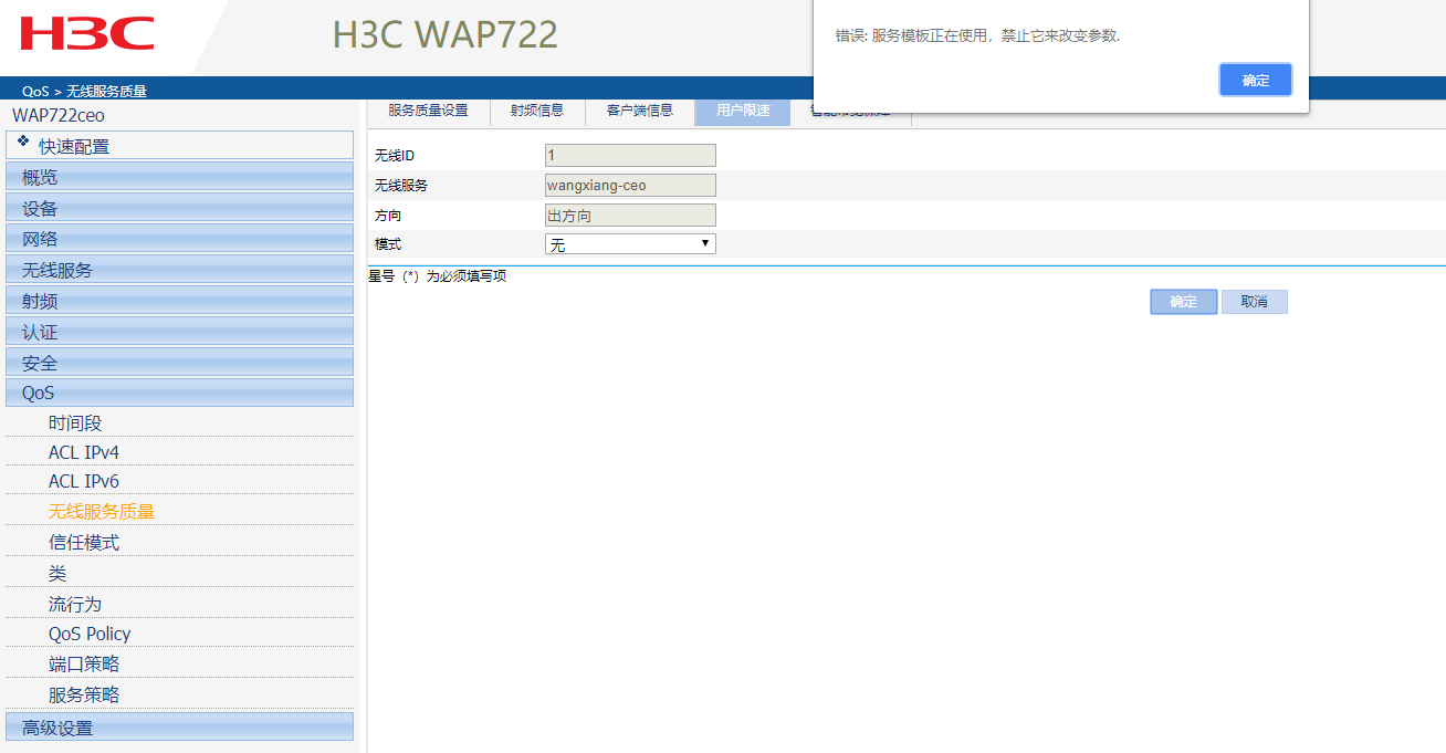H3C WAP722+配置用户限速时间,提示 错误:服务模板正在使用