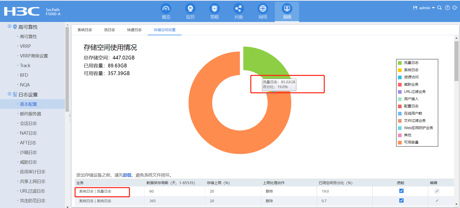 防火墙F5000系统流量日志开启后占用存储空间太大怎么解决、客户要求保存60天、开启三十天就占了存储的百分之20、有什么办法可以解决、又能保存60天、系统流量日志不会太高