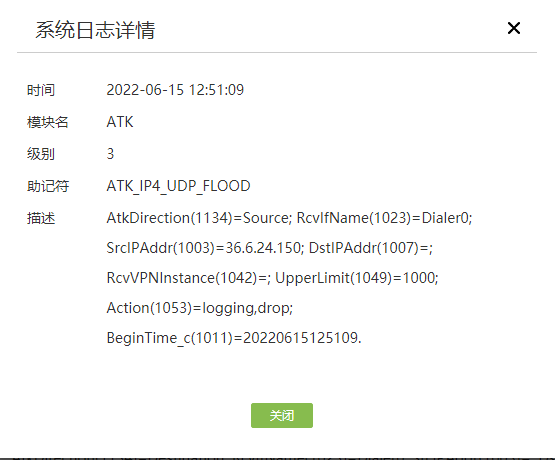| ATK_IP4_UDP_FLOOD | RcvIfName(1023)=[STRING];DstIPAddr(1007)=[IPADDR];DstPort(1008)=[UINT16];RcvVPNInstance(1042)=[STRING];UpperLimit(1049)=[UINT32];Action(1053)=[STRING];BeginTime_c(1011)=[STRING]. | 3 | 单位时间内指定IPV4目的地址的UDP报文数超过阈值,触发日志 |