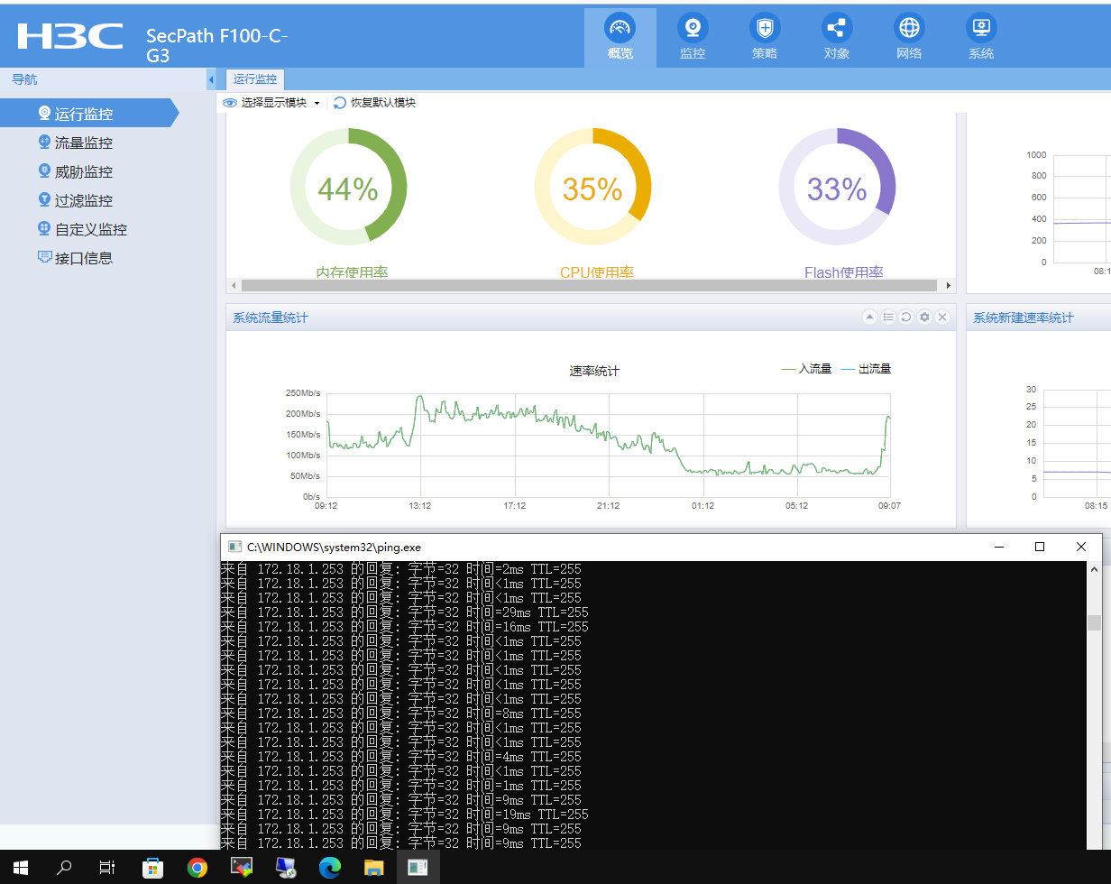 刚刚打了400工程师电话咨询了,他说应该是是Untrust-Trust调用了IPS策略做深度检测了,会影响到防火墙50%的性能,局域网内ping防火墙正常,是Trust-Untrust,不需要IPS检测。不知道是不是这个原因。图1,关闭IPS调用之前的ping。图2 ,开启IPS检测后的ping。