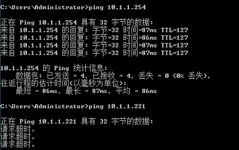 从工厂ping回总部,ping总部路由10.1.1.254可以通,但ping总部内网电脑不通: