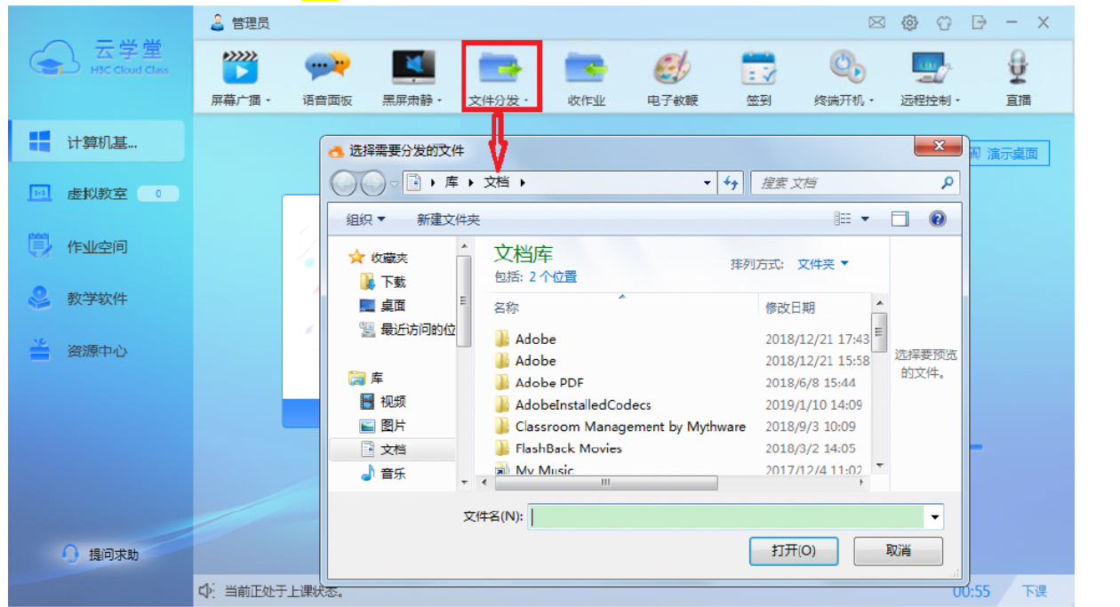 教师通过文件分发功能,可选择教师端本地文件发送至学生素材空间。学生访问素材空间获取教师分发的文件。当接入ARM学生端时,教师端需处于上课状态此功能才可见。