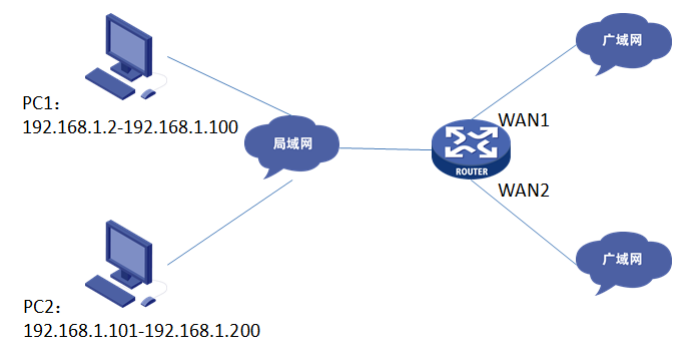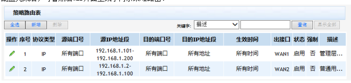 路由器的WAN1、WAN2口分别接运营商线路上网,企业内网分为普通用户区(IP 地址范围是192.168.1.2~192.168.1.100)和管理层用户区(IP 地址范围是192.168.1.101~192.168.1.200)。要求通过设置策略路由,实现管理层用户区通过WAN1口上网,普通用户区通过WAN2口上网的需求。