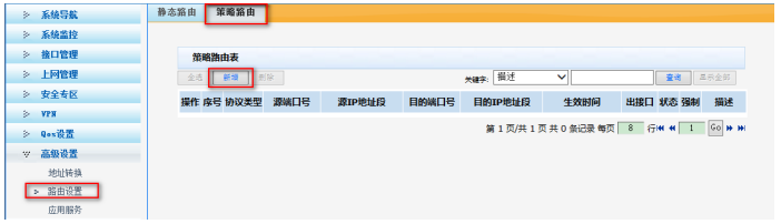 单击【高级设置】--【路由设置】--【策略路由】,点击【新增】