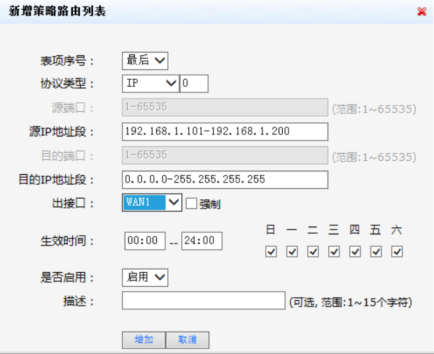 配置管理层用户区网段通过WAN1口上网的策略路由:选择协议类型为ip,源IP地址段设置为“192.168.1.101—192.168.1.200”,目的地址设置为“0.0.0.0-255.255.255.255”,出接口选择“WAN1”,是否启用选择“启用”,生效时间可以根据现场的情况进行选择配置,配置好后点击【增加】
