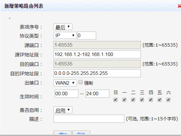 同理,再配置普通用户区网段通过WAN2口上网的策略路由:选择协议类型为“ip”,源IP地址段设置为“192.168.1.2—192.168.1.100”,目的IP地址设置为“0.0.0.0-255.255.255.255”,出接口选择“WAN2”是否启用选择“启用”,生效时间可以根据现场的情况进行选择配置,配置好后点击【增加】