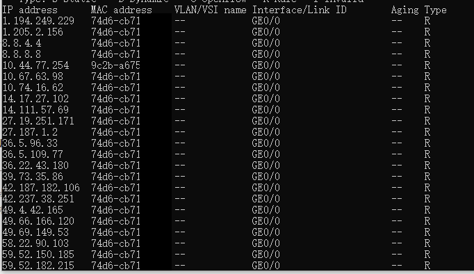 IP address MAC address VLAN/VSI name Interface/Link ID Aging Type 1.194.249.229 核心mac -- GE0/0 -- R 1.205.2.156 核心mac -- GE0/0 -- R 8.8.4.4 核心mac -- GE0/0 -- R 8.8.8.8 核心mac -- GE0/0 -- R 10.67.63.98 核心mac -- GE0/0 -- R 10.74.16.62 核心mac -- GE0/0 -- R 14.17.27.102 核心mac -- GE0/0 -- R 14.111.57.69 核心mac -- GE0/0 -- R 27.19.251.171 核心mac -- GE0/0 -- R 27.187.1.2 核心mac -- GE0/0 -- R 36.5.96.33 核心mac -- GE0/0 -- R 36.5.109.77 核心mac -- GE0/0 -- R 36.22.43.180 核心mac -- GE0/0 -- R 39.73.35.86 核心mac -- GE0/0 -- R 42.187.182.106 核心mac -- GE0/0 -- R 42.237.38.251 核心mac -- GE0/0 -- R 49.4.42.165 核心mac -- GE0/0 -- R 路由器上的ARP表是这样的