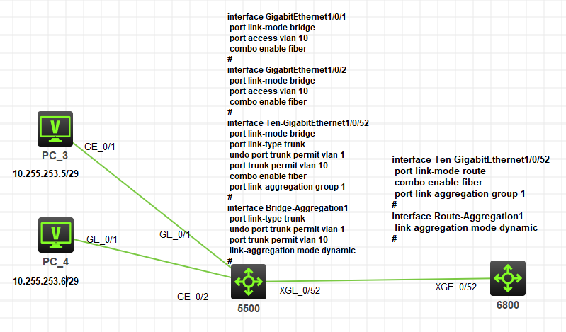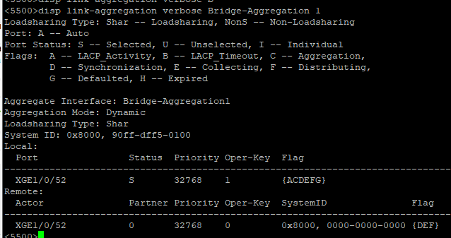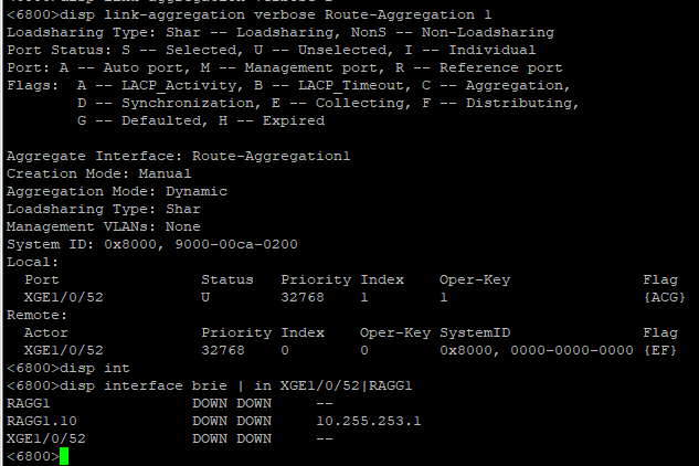 当5500的BAGG1配置port link-type trunk及port trunk permit vlan xxx时,5500的bagg1up,但6800的ragg1及xge1/0/52down