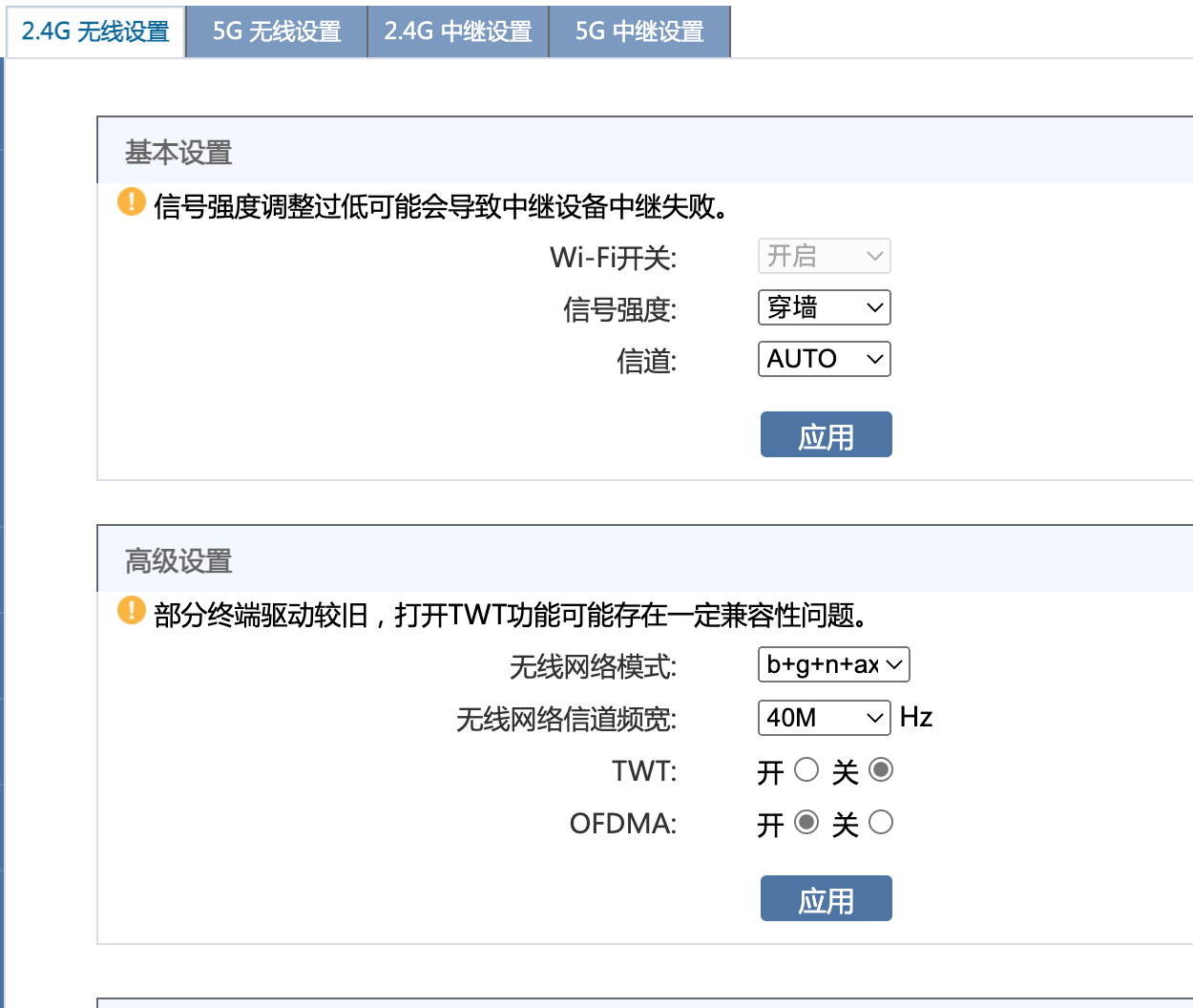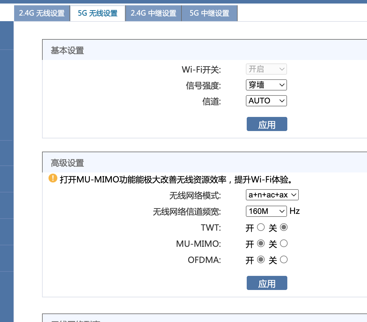 以前用的华硕的路由器,电视盒子看视频一点都不卡,宽带是北京移动1000M光纤直接入户,电视盒子型号是EC6110-M,华为的。用华硕路由器的时候,电视盒子可以连5g,现在用nx54,5g信号连不上,只能用2.4g,但是看酷喵大屏经常卡。以下是无线设置,不知道还能怎么优化才能让电视盒子正常工作?用nx54做得桥接,拨号通过nx54拨号,光猫只做信号转换。下面是nx54的无线设置