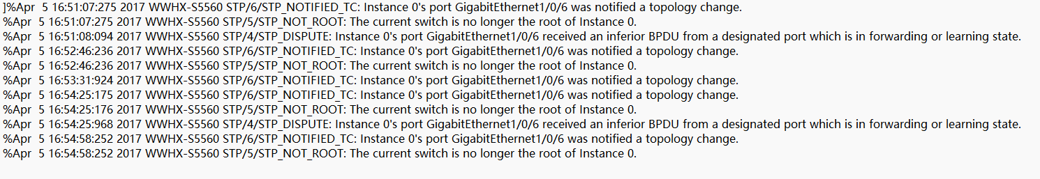 128.13 STP_NOT_ROOT 日志内容 The current switch is no longer the root of instance [UINT32]. 参数解释 $1:生成树实例编号 日志等级 5 举例 STP/5/STP_NOT_ROOT: The current switch is no longer the root of instance 0. 日志说明 本设备某生成树实例配置为根桥,但它收到比自身更优的BPDU报文后,就不再是此实例的根桥 处理建议 检查桥优先级配置及是否存在恶意攻击 128.14 STP_NOTIFIED_TC 日志内容 [STRING] [UINT32]'s port [STRING] was notified a topology change. 参数解释 $1:生成树实例或VLAN $2:生成树实例编号或VLAN ID $3:接口名 日志等级 6 举例 STP/6/STP_NOTIFIED_TC: Instance 0's port GigabitEthernet1/0/1 was notified a topology change. 日志说明 远端相连设备通知本设备某接口所在生成树实例或VLAN的拓扑发生变化 处理建议 检查拓扑变化的原因。如果是有链路down了,就恢复此故障链路