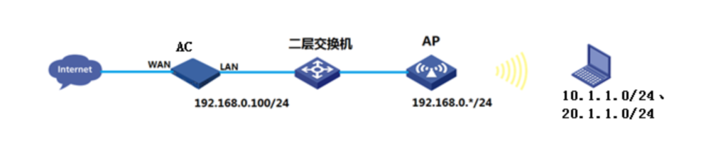 1、AC和AP通过二层交换机相连,AC的1口和交换机1口互连,AP接在交换机的2口。Vlan1为AP管理vlan,网段为192.168.0.0/24,使用二层自动注册。AC作为DHCP服务器。