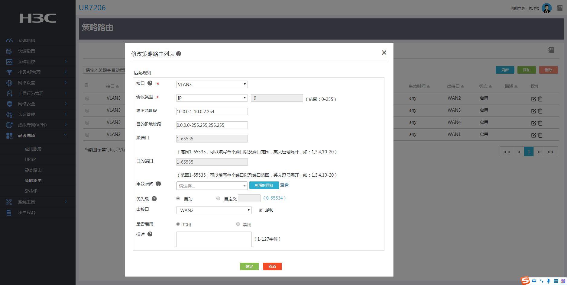 ¡ 在“是否启用”配置项处,设置策略路由是否启用。