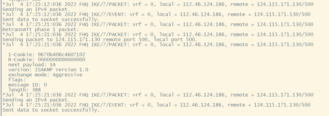 000000000就是ipsec的第一个报文,也就是说第一个报文交互失败;建议排查链路吧