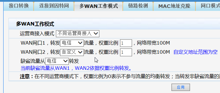 新买的H3C ER8300G2 WAN双线路设置,使用电信和移动网络,原来WAN1是移动时禁用WAN2电信,移动还能能正常使用,现在改为WAN1是电信,WAN2是移动,如果WAN2(移动)禁用了WAN1(电信)也无法使用。我主要是想把电信作为主网络,移动作为备用网络,现在想测试断开其中一条线路另一条是否能正常,但发现只要禁用移动所使用的WAN口,电信也用不了了。我怀疑有影响的设置就是多WAN模式,但多次修改以及设置成同运营商也是一样的结果,哪位熟悉这款路由的麻烦指教下。谢谢!