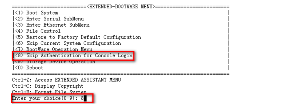 #设备启动过程中根据提示按 crtl+B进入 bootware界面,选择 <8>跳过 Console 密码认证