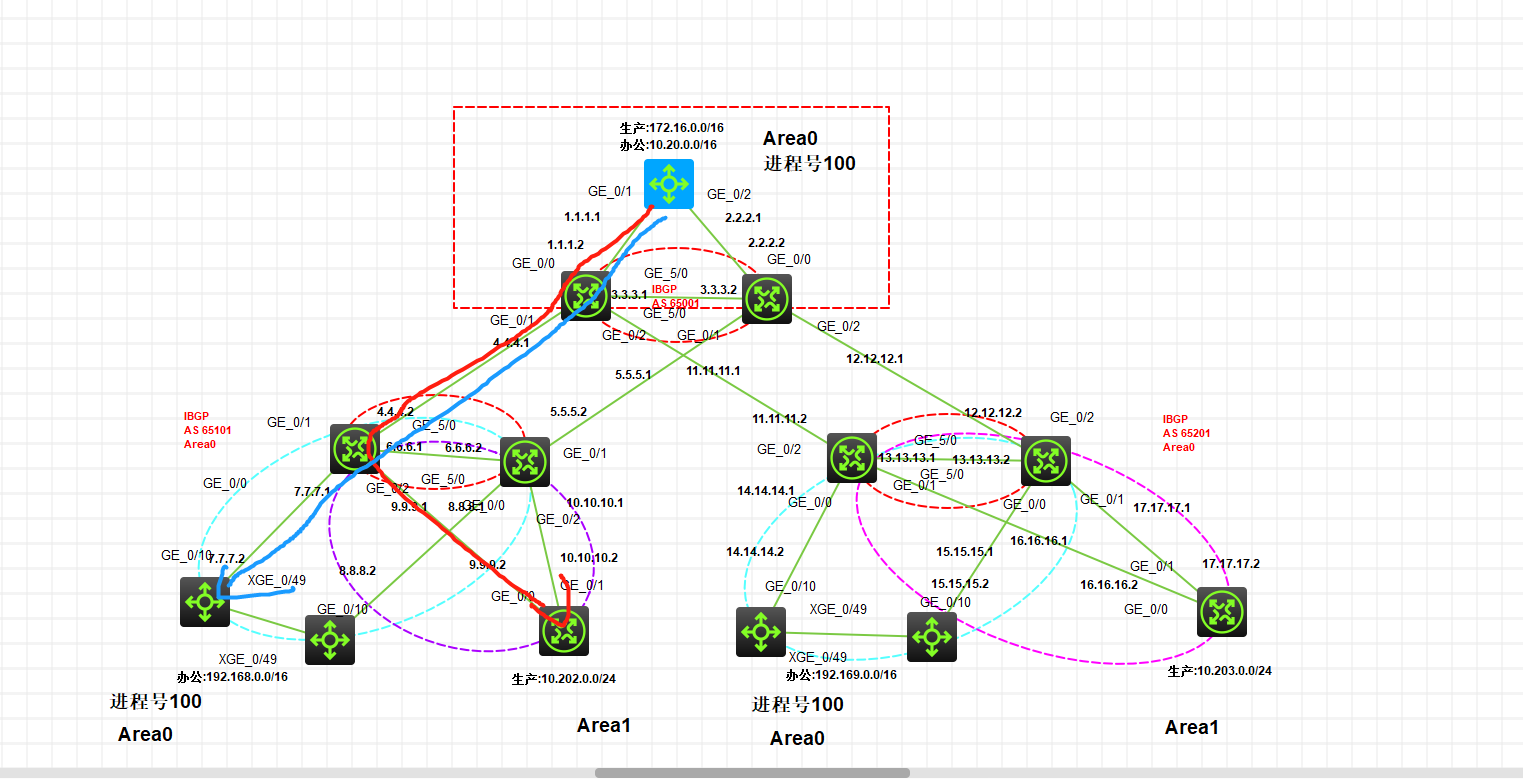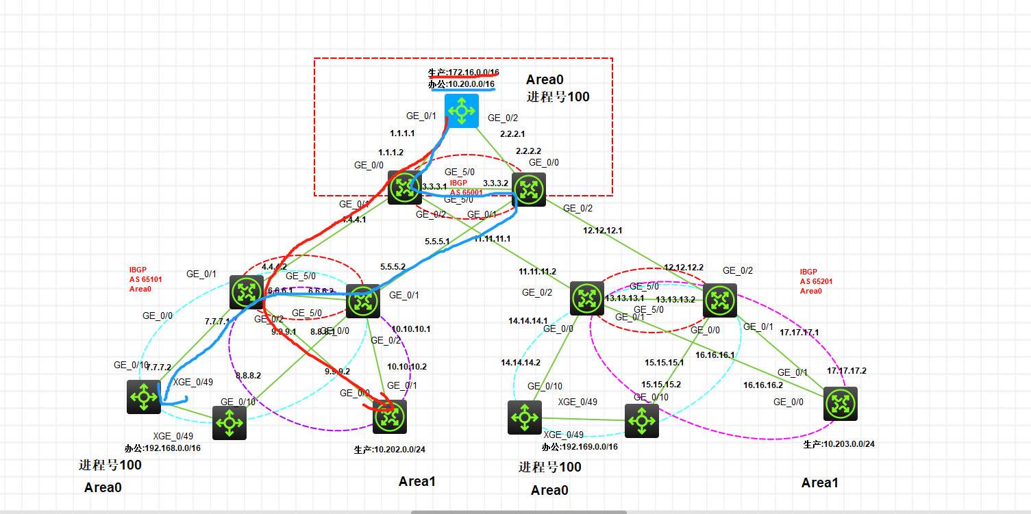 你这个配置有问题,策略应该在as65101里面配置,通告给总部的时候生产和办公的网段MED不同,哪边med小优先从哪边回程