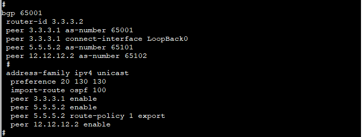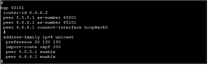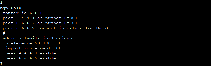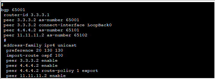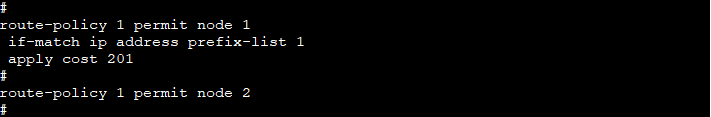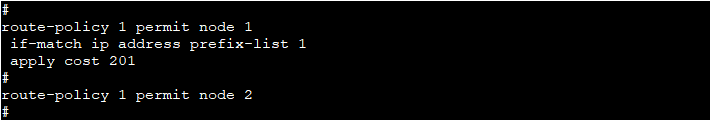 分部主路由器: ip prefix-list 1 index 10 permit 10.20.0.0 16 # route-policy 1 permit node 1 if-match ip address prefix-list 1 apply cost 201 # route-policy 1 permit node 2 分部备路由器: # ip prefix-list 1 index 10 permit 172.16.0.0 16 # route-policy 1 permit node 1 if-match ip address prefix-list 1 apply cost 201 # route-policy 1 permit node 2